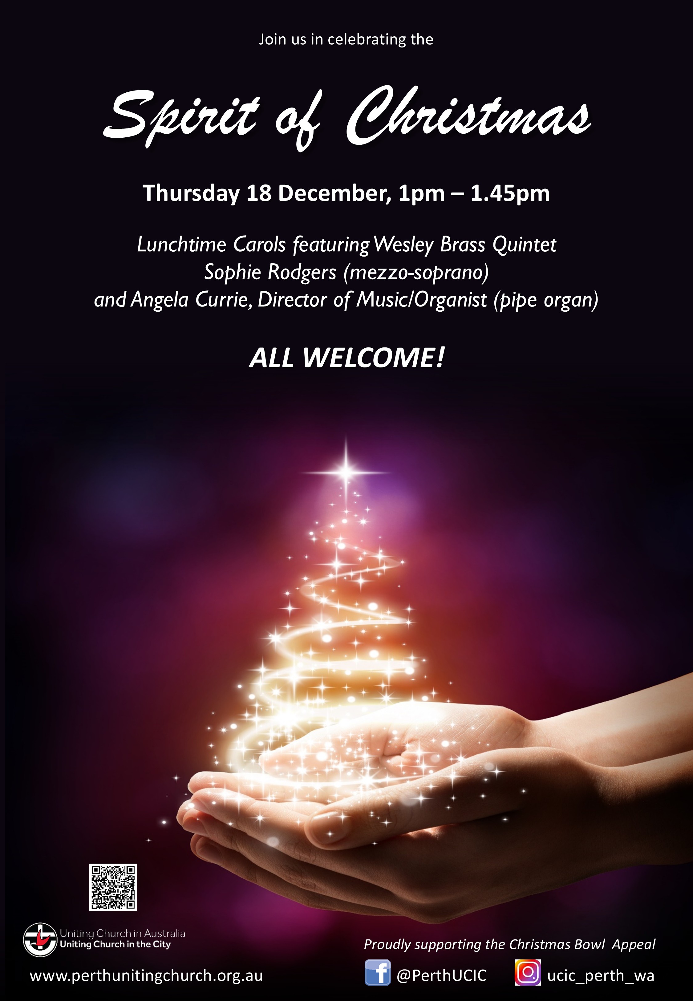 Join us from 1pm on Thursday 18 December for our Lunchtime Carols at Wesley Church, on the corner of William & Hay Streets, Perth, featuring beautiful music from the Wesley Brass Quintet, Sophie Rodgers (mezzo-soprano) and Angela Currie, Director of Music/Organist (pipe organ).